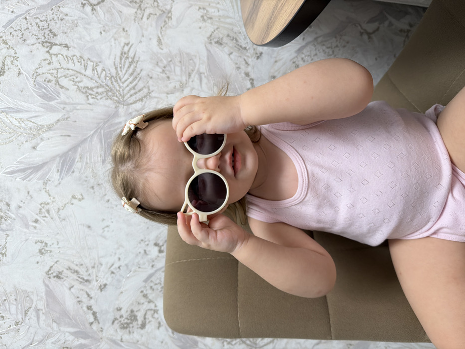 An indoor scene in what appears to be a private residence in Reshetnikovo, Russia, depicts a young child seated on a brown upholstered chair. The child has light-colored hair, secured with two small, light-colored hair clips. They are dressed in a light pink sleeveless bodysuit featuring a fine diamond knit pattern. The child holds a pair of round-framed, cream-colored sunglasses with dark lenses to their face using both hands, looking forward with a neutral expression. The background consists of light-colored wallpaper patterned with large, abstract feather or leaf motifs in muted tones. A portion of a round, dark brown wooden table with a black edge is visible on the right side of the frame.