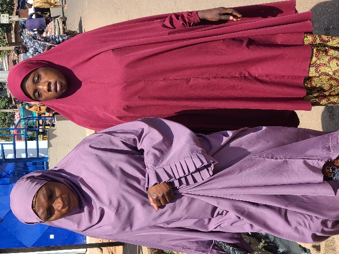 The image displays two adult women standing on a street in the city of Jos, Nigeria, during daylight hours. The woman on the left wears a light purple hijab and a matching full-length abaya, looking downwards and slightly to her right. Her right hand is partially visible, holding a fold of her garment. Below her abaya, a patterned skirt is visible. The woman on the right wears a deep maroon hijab and a matching full-length abaya, looking directly forward with a neutral expression. A patterned skirt is also visible beneath her abaya. Her left hand hangs by her side. In the background, to the left, a blue structure with a partial "PDS" sign is visible. Further back, on a road surface, several blurred figures, including an individual pushing a loaded handcart and a blue and green motorized tricycle, indicate a busy urban environment.