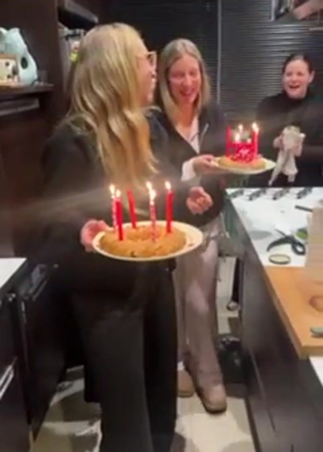 In a brightly lit kitchen, three women celebrate a birthday, each holding a plate with a pastry lit with candles. The woman in the foreground, wearing glasses and a black jacket over a dark top with black pants, smiles broadly and looks directly at the camera. She holds a plate with a golden-brown, ring-shaped pastry adorned with red candles. Behind her, another woman smiles as she also holds a plate with a pastry and burning candles. The third woman, standing further back, also smiles. The kitchen features dark wooden cabinets, a light countertop, and modern window blinds in the background. The atmosphere is jovial and celebratory, with everyone smiling and holding up the pastries with lit candles.