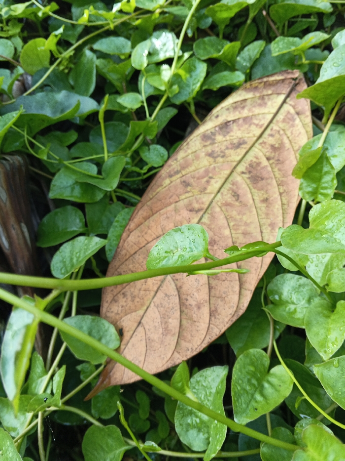 A large, brown, decaying leaf rests among vibrant green foliage. The leaf, prominently positioned in the center, features distinct parallel veins. Small, round leaves, glistening with moisture, intertwine around it, creating a dense, verdant backdrop. Delicate green stems weave through the scene, adding depth and texture to the composition. A sliver of wood is faintly visible in the background.