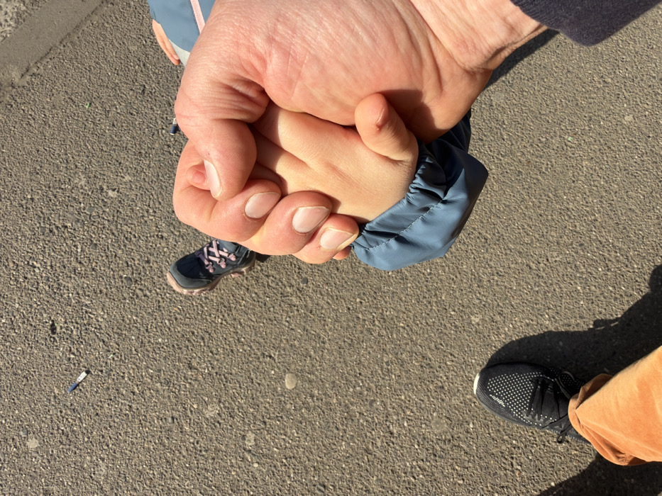 The image presents an overhead view of two individuals' hands and lower extremities on a paved surface