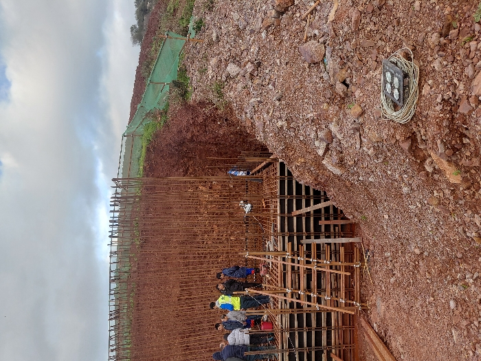 A construction site reveals rebar structures and wooden framework, likely for a retaining wall or foundation