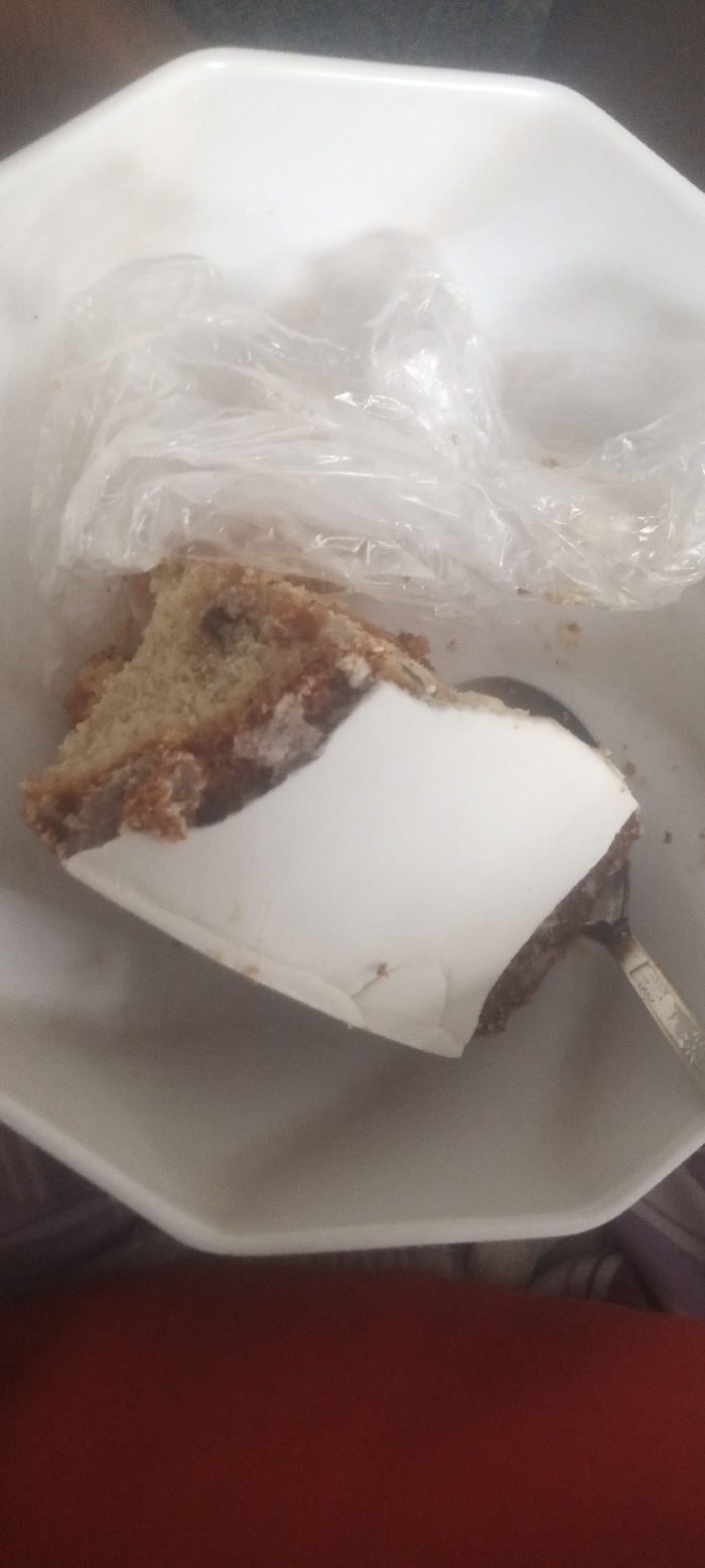 A partially consumed slice of cake is contained within a white, octagonal bowl. The cake possesses a light-colored crumb with dark inclusions and is topped with a white frosting layer, parts of which appear fractured or separated. A clear, crumpled plastic bag lies partially over the cake inside the bowl. A silver-colored spoon is visible adjacent to the cake. The bowl rests on a dark red, possibly fabric-covered, surface. No individuals are present. The specific location within Barden Yana, Nigeria, is not discernible from the visual information provided.