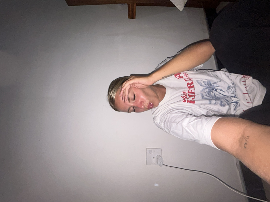 young adult female seated indoors, likely in a room within Ahangama, Sri Lanka. She has blonde hair pulled back and a reddish hue on her face, with her eyes closed and lips pursed in a kissing motion. Her right hand rests on her forehead. She wears a white short-sleeved t-shirt with a "Florida 1980" graphic featuring red text and blue palm trees and a beach scene, along with dark trousers. A small, illegible tattoo is visible on her left forearm, which extends into the bottom left of the frame, suggesting a selfie. The background consists of a plain, light-colored wall. To the left, a white electrical wall socket is visible with a white plug inserted and a black cable extending downwards. A dark wooden structure, possibly a bed frame, is partially visible on the far right. The scene is illuminated by artificial light.