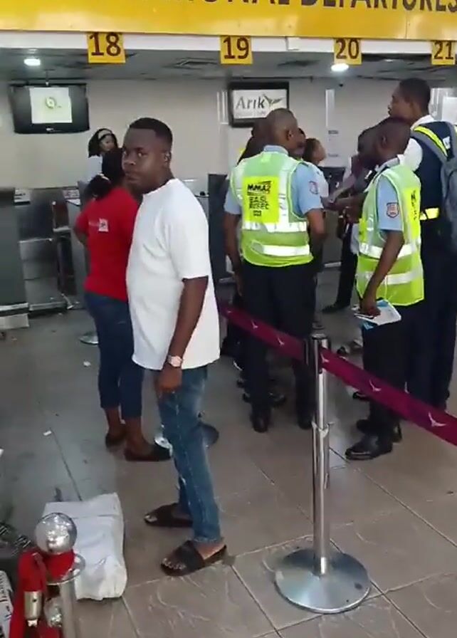International Departures area of an airport, where passengers are waiting in front of desks labeled 18 through 21. The backdrop is a yellow sign with the words "INTERNATIONAL DEPARTURES" printed in black, along with an airplane graphic. A security line is marked by silver posts and a maroon ribbon. The camera captures several people. In the foreground, a man in a white T-shirt and blue jeans stands holding a package, looking towards the right. Behind him, a woman in a red shirt and jeans stands near the left edge of the frame. A small group of airport staff wearing light blue shirts and bright yellow vests marked with "MMA2" are clustered together. Some appear to be talking to one another. The floor is made of light-colored tiles. The overall atmosphere seems to be the standard hustle and bustle of an airport setting.