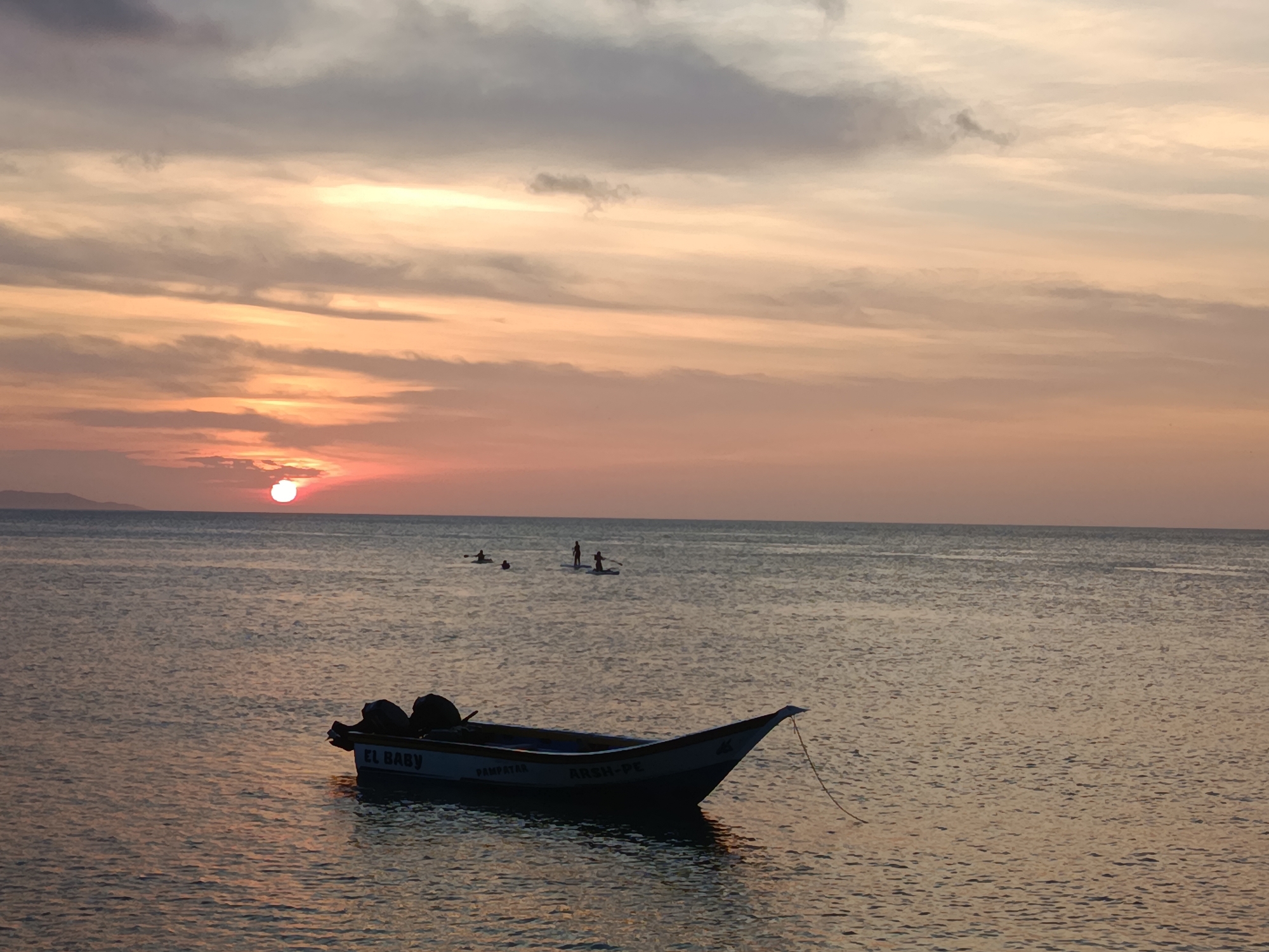 The image depicts a sunset over the water in Juan Griego, Venezuela. In the foreground, a small boat named "El Baby" is moored, facing right. The boat has two outboard motors at the stern. In the middle distance, there are three figures on stand-up paddleboards. The sun is setting on the horizon, casting a red and orange glow on the water and the sky. The sky is a mix of orange and gray clouds. A landmass can be seen on the left horizon. The water is calm.