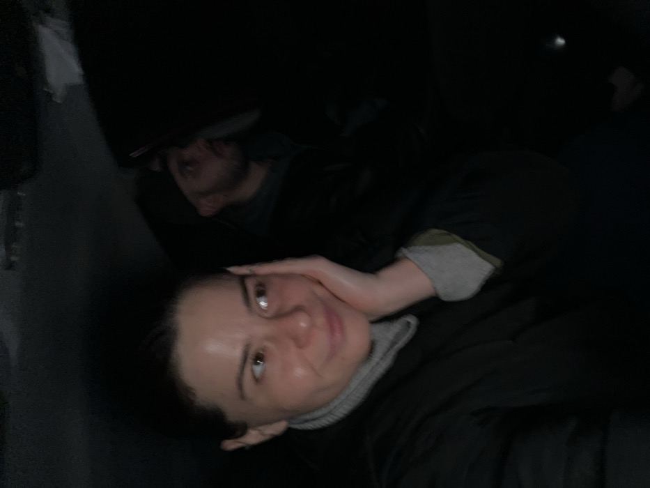 A woman with dark hair is smiling and touching her cheek with her hand. She's wearing a grey turtleneck sweater and a dark jacket. A man with a beard is behind her. The lighting is dim.