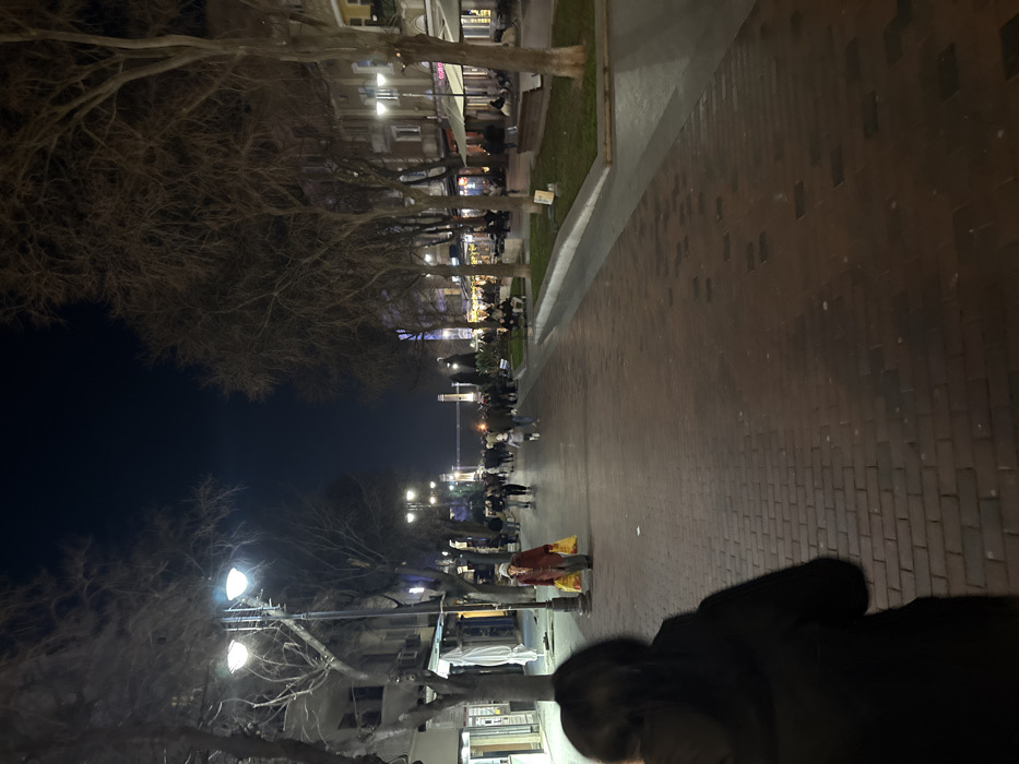 This image depicts a pedestrian street at night in Varna, Bulgaria, likely a central area such as Knyaz Boris I Street, with the Asparuhov Bridge visible in the distant background. The scene is illuminated by numerous streetlights and lights emanating from commercial establishments. The foreground features the back of a person with dark hair wearing a dark jacket, partially obscuring the lower left portion of the frame. The paved street, composed of reddish-brown brick pavers, extends into the distance. In the midground, an elderly individual, possibly female, wearing a red coat and light-colored head covering, walks towards the camera on the left side of the street, carrying two yellow shopping bags. Further down the street, various pedestrians, including an adult and a child, are visible walking in both directions. The street is lined on both sides by bare deciduous trees. To the right, a raised green space with grass and small plants separates the main pedestrian path from a row of buildings. These multi-story structures house commercial establishments, identified by illuminated shopfronts and outdoor seating areas with tables and chairs, where several people are seated. Similar buildings with shops and cafes are present on the left side of the street. Numerous streetlights with bright white globes line the street. At the far end of the street, under a dark night sky, a prominent bridge-like structure with two distinct towers and supporting cables is visible, consistent with the Asparuhov Bridge over Varna Lake.