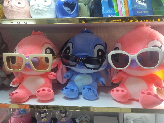 The image displays a retail merchandise arrangement on a white shelf with gold-colored trim, consistent with a store setting in Barza Municipality, Syria. Three plush toys are positioned facing forward. On the left is a pink Angel-like plush toy wearing oversized cream-colored square-frame sunglasses with amber-tinted lenses. In the center is a blue Stitch-like plush toy wearing black rectangular sunglasses. On the right is another pink Angel-like plush toy, wearing white hexagonal-frame sunglasses with dark lenses. Above, on an upper shelf, other merchandise is visible, including pink and white owl figurines, a blue cup with a heart cutout, and boxed items labeled "10PCS" and "BLUEBERRY." Portions of additional retail items, such as pink snow globes, are partially visible on a lower shelf. No individuals are present in the scene, and no overt actions or interactions are occurring beyond the static display of merchandise.