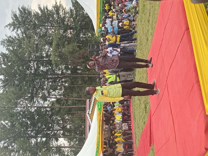 An outdoor public gathering is depicted in West Kabras ward, Kenya, featuring a temporary stage and a large audience on a grassy field