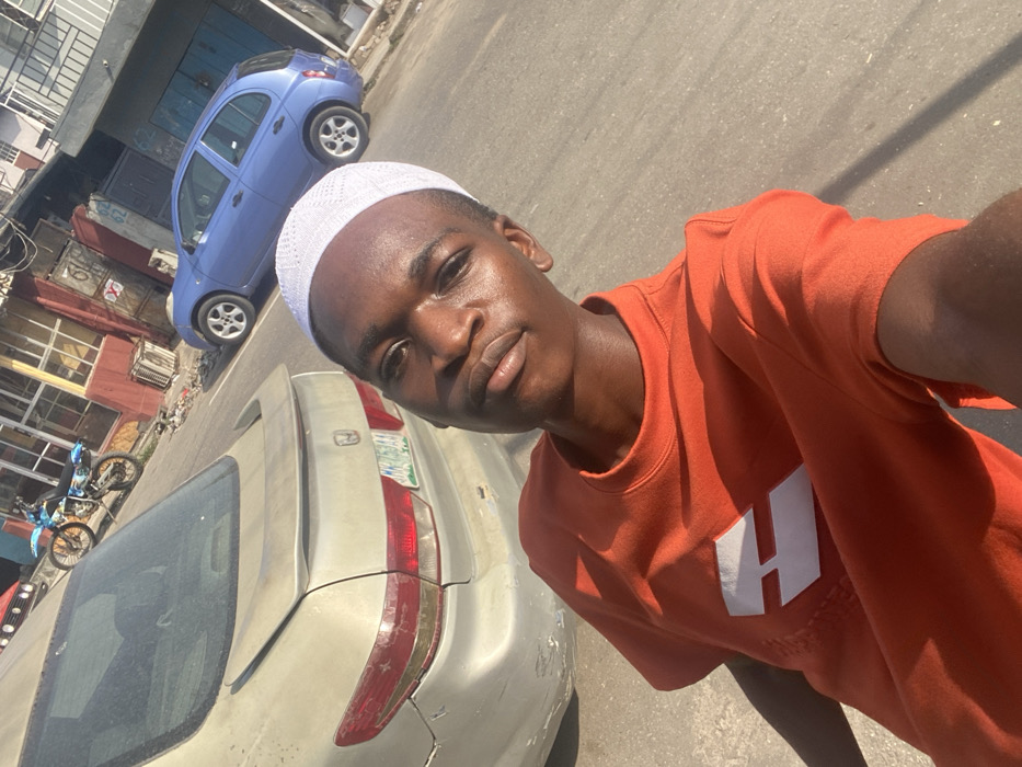 A young man wearing a white kufi and an orange t-shirt with a white letter on it, possibly an "H," is taking a selfie outdoors. The background includes parked cars, a light blue one and a silver one with visible damage to the rear. A motorcycle is visible in the background on the left side of the frame. The setting appears to be a street, possibly near shops or buildings. The photo is taken from a slightly low angle.