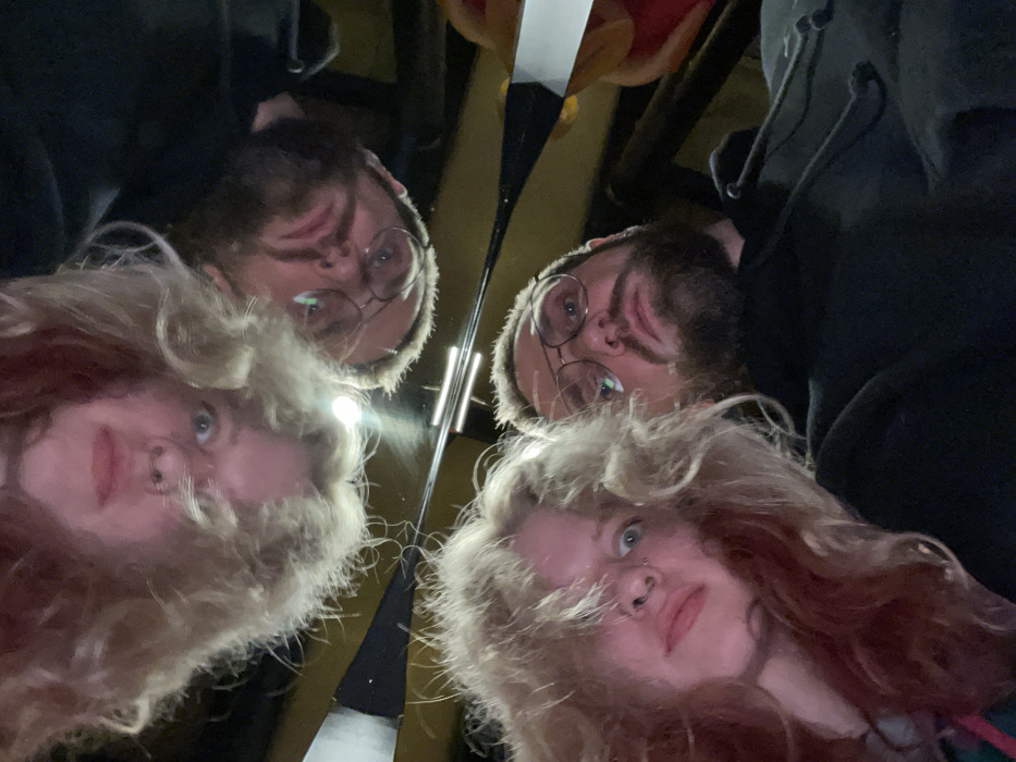 Two people, reflected in a shiny surface, stare upward. A fair-skinned woman with voluminous blonde hair and facial piercings dominates the lower frame. Above, a man with a beard and glasses peers down, his features partially obscured by a dark hooded garment. The reflective surface distorts the image, creating a mirrored duplication of the subjects. Streaks of light glint off the surface, adding visual interest.