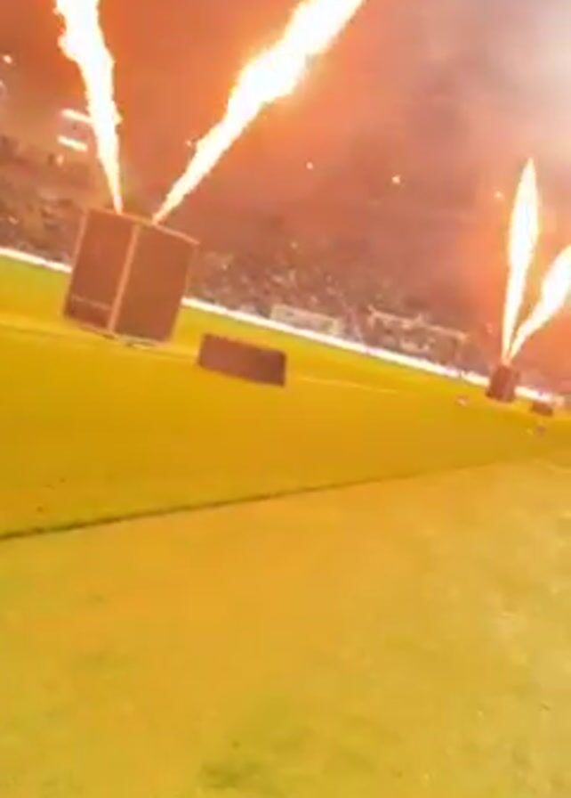 fireworks being set off at a stadium. It is nighttime, and the stadium lights are on. There is smoke in the air, obscuring some of the people in the stands. Several pyrotechnic devices are shooting flames and sparks high into the air, creating a dazzling display. There are square, black boxes positioned along the edge of the field, and the fireworks are being launched from near these boxes. The camera is positioned close to the ground, giving a low-angle view of the spectacle.