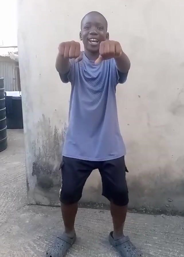 A young boy stands in a paved outdoor area, facing the camera and smiling. He is wearing a gray t-shirt, black shorts, and gray Crocs. His fists are clenched and pointed towards the camera. Behind him is a light-colored wall with some staining near the bottom. To the left of the frame, there are stacked black water containers and glimpses of a roofline in the background. The boy’s arms are straight and extended in front of him.