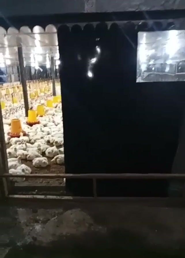A medium shot shows the interior of a chicken coop filled with broiler chickens
