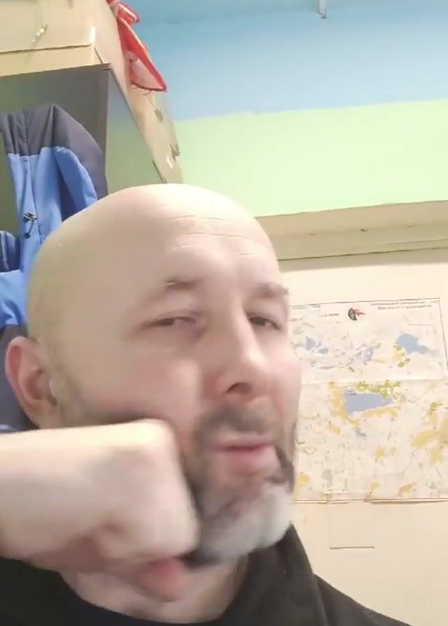 The video begins with a close-up of a bald man with a graying beard, wearing a black fleece jacket