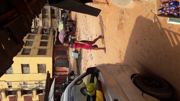 The image depicts an urban street scene in Onitsha, Nigeria, under daylight conditions