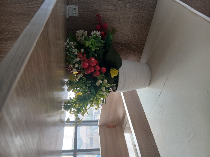 A pot of red and green artificial flowers sits on a light-colored, wooden surface. The pot is white and cylindrical, contrasting with the vibrant colors of the flowers. A window with metal frames is visible in the lower part of the image, suggesting the scene is indoors. The perspective gives a close-up view of the floral arrangement.