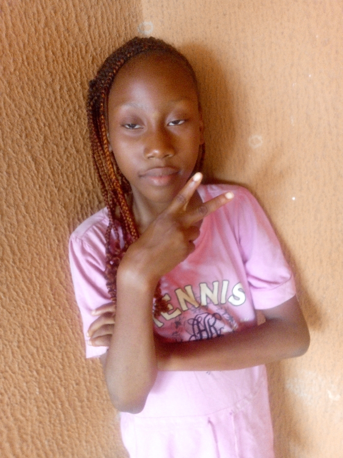 A young female with dark skin and long, reddish-brown braided hair stands against a textured, light brown wall in Zango-ndaji, Nigeria