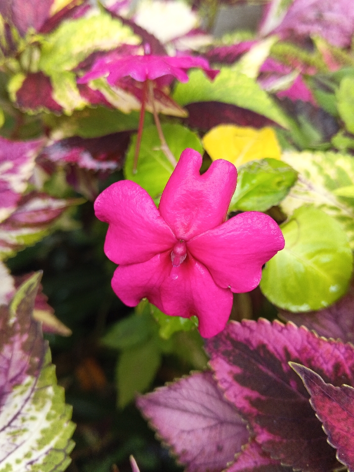 A close-up displays a vibrant pink Impatiens flower as the focal point, its five petals slightly overlapping. Behind it, another smaller flower of the same kind is noticeable. A variety of leaves with patterns in green, yellow, purple, and burgundy create a colorful backdrop. The leaves have jagged edges.