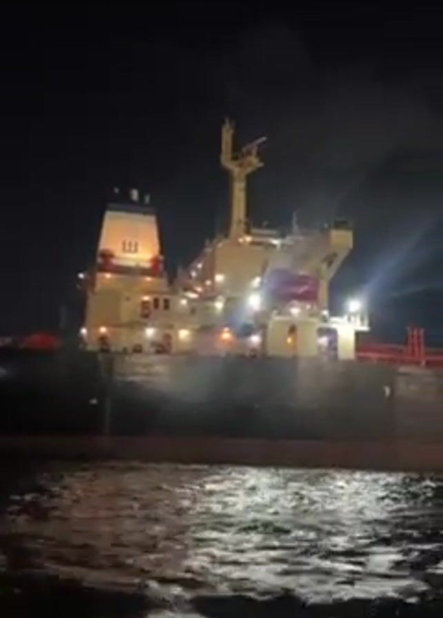 At night, a large ship is seen on the water. The ship has a light-colored superstructure with multiple lights illuminated. It appears to be a bulk carrier with cargo holds visible. The hull is dark in color. The water reflects the ship's lights, creating patterns on the surface. The sky is dark, with some clouds partially obscuring it. The video appears to be taken from another boat or vessel, close to the water level.