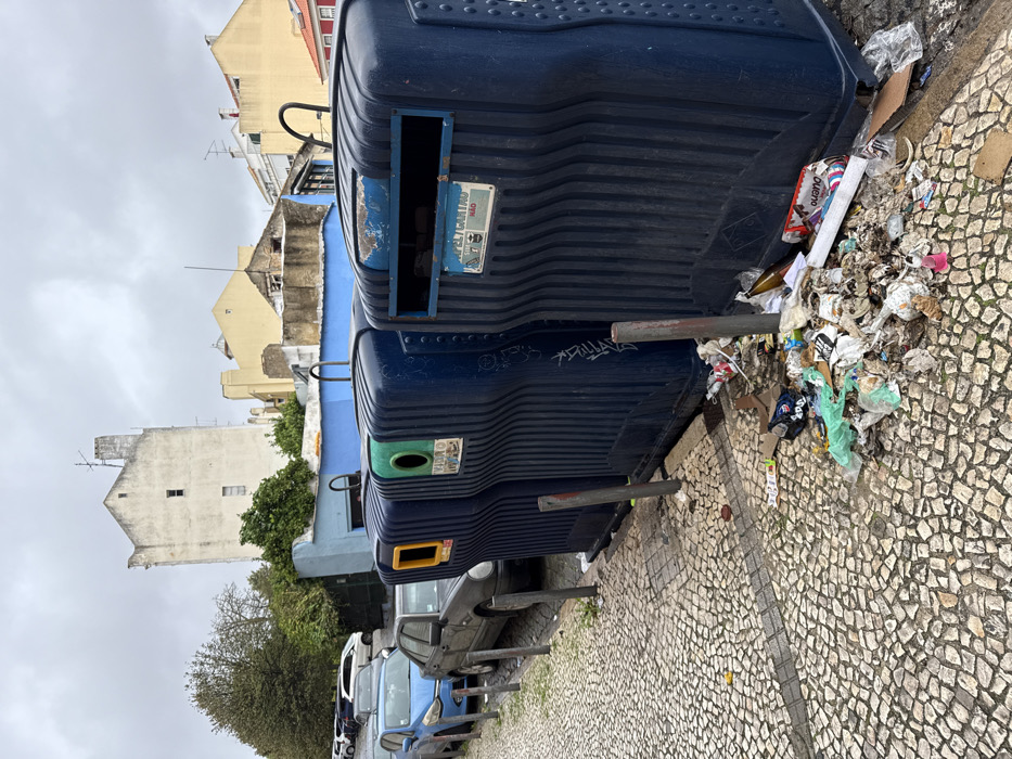 The image displays an urban street scene in Lisbon, Portugal, under an overcast sky. In the foreground, three large, dark blue, ribbed recycling bins are positioned on a traditional Portuguese cobblestone pavement. From left to right, the first bin features a yellow rectangular opening for "VIDRO" (glass), the second has a green circular opening also for "VIDRO" (glass), and the third bin presents a horizontal rectangular slot labeled for "PAPEL/CARTÃO" (paper/cardboard). A smaller, faded sign on the third bin provides recycling instructions in Portuguese. Directly in front of and to the right of these bins, a significant pile of mixed refuse is scattered across the cobblestones, including plastic bags, paper, cardboard, food wrappers, and various discarded items. Several dark gray metal bollards are visible, positioned around the bins, some exhibiting signs of wear or slight bending. The cobblestone pavement displays variations in color and pattern. In the midground, a row of parked cars, including a blue hatchback and a dark-colored sedan, is visible on a gently inclined surface. Behind the cars, a prominent bright blue building wall is partially covered by green foliage. Above this, a tall, narrow, light-colored building with a single visible window and a distinctive, weathered chimney-like structure on its roof stands against the sky. Further into the background, a dense cluster of urban buildings with varying heights, terracotta roofs, and facades in shades of yellow and cream completes the scene. No individuals are visible.
