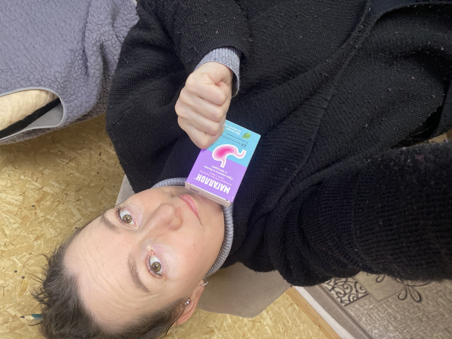 A single adult female is depicted in a high-angle, close-up photograph. She has fair skin, light brown hair styled in a bun, and light brown eyes, looking directly at the viewer with a slight smile. She wears a grey turtleneck sweater under a dark, possibly black, knit cardigan or jacket, which exhibits visible pilling. A small silver hoop earring is visible in her left ear. She holds a small, rectangular purple and white box in her left hand, displaying the Cyrillic text "МАГАПЛОН" (MAGAPLON) and an illustration of a human stomach. Additional text on the box, also in Cyrillic, translates to "For heartburn and heaviness in the stomach" and indicates "24 tablets." The background features a light brown, textured wooden wall, possibly oriented strand board (OSB), in the upper left and top portions of the frame. To the upper right, a grey, textured fabric object is partially visible. The lower left foreground shows a section of a light-colored rug with dark, swirling patterns. The specific location within the city of Ol'khovskoye, Russia, cannot be determined from the visual information presented.