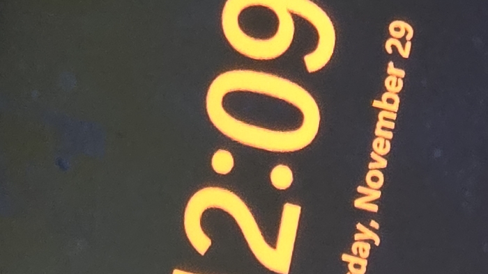 A digital display screen, located in Lompoc, United States, presents bright orange alphanumeric characters against a dark, featureless background. The time "12:09" is prominently displayed in a large font. Below and slightly to the left, partially cropped, the text "day, November 29" is visible, indicating the date. The text elements appear to be viewed at a slight upward angle. The dark background exhibits several faint, irregular smudges or dust particles, notably in the upper left and central right areas. No individuals, actions, or specific environmental features beyond the digital display are discernible.