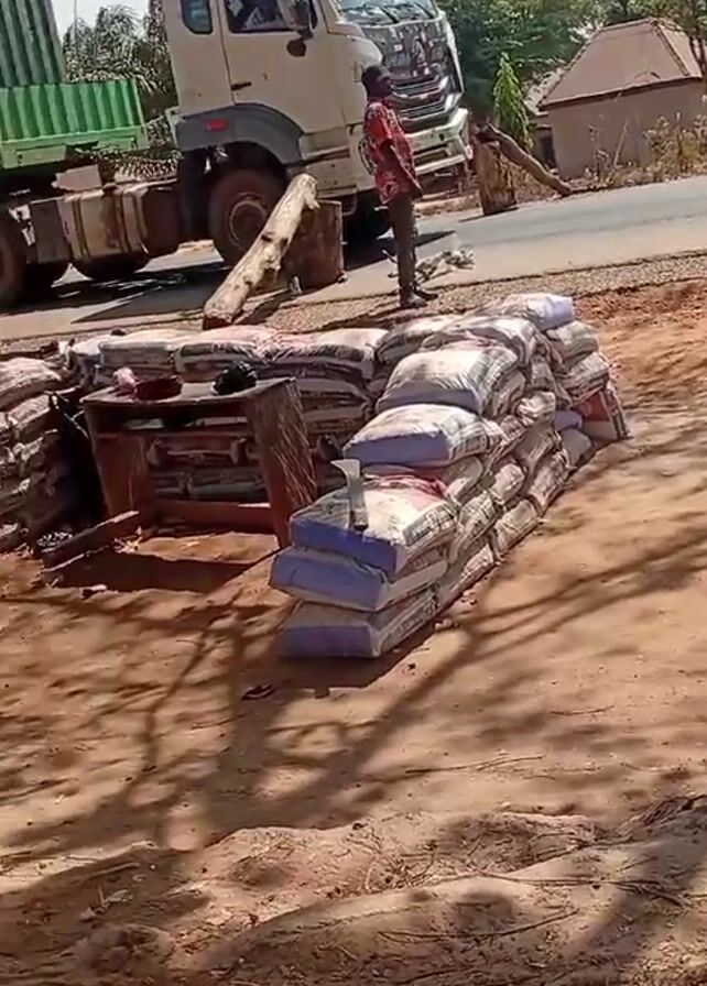 roadside scene in what appears to be a rural area. In the foreground are stacks of bagged cement or similar material, arranged around a makeshift table. A man in a colorful shirt stands near a truck, leaning against a log. As the video progresses, the camera pans slightly to reveal a road with vehicles passing by, including a tanker truck and a container truck. The background features simple buildings with thatched roofs, and scattered trees. The ground is mostly dirt and dry vegetation.