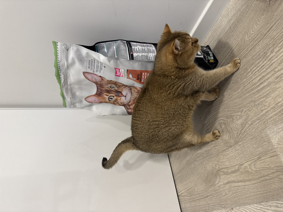A golden-brown British Shorthair kitten reaches its paws up a light beige wall with wood-grain texture. The cat's tail curls slightly. A large bag of "Isin" brand salmon-flavored cat food sits on a white surface to the cat's left. The bag features a prominent photo of a brown tabby cat. The bag is angled, partially obscuring other items behind it.