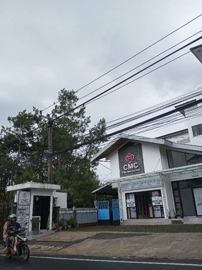 A daytime view captures a medical facility identified as "CMC CITRA MEDICAL CENTER" in Ambakirano, Madagascar, under an overcast sky. The primary building is a multi-story white structure with a prominent black and pink "CMC" logo featuring a crown emblem on its facade. The front section of the building includes glass doors and windows, with signs visible in an indistinct language, including references to "APOTEK CMC 24 JAM" (CMC Pharmacy 24 Hours). To the left of the main entrance, a smaller white guard post or entrance booth also displays the "CMC" logo. A blue metal gate and a grey wall enclose the property between the booth and the main building. In the foreground, a paved road with a white line runs horizontally. A dark-colored motorcycle, operated by a driver wearing a helmet and accompanied by a passenger, travels from left to right on this road. Tall, slender pine trees are visible behind the buildings and to the left, partially obscured by a utility pole dense with multiple overhead power lines and cables that extend across the upper frame of the image. Potted plants are positioned near the building's entrance.