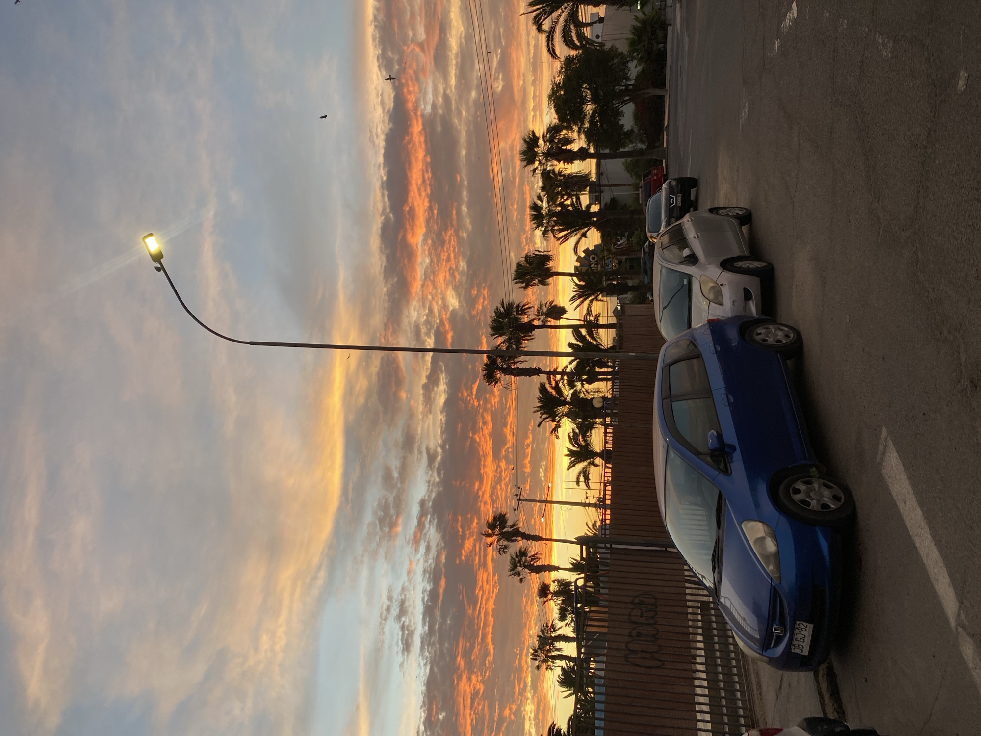 The image presents a sunset scene in Arica, Chile, taken from a street level perspective. The sky displays hues of orange, gold, and light blue with scattered clouds. A row of palm trees lines the horizon, silhouetted against the vibrant sky. A street lamp extends into the frame from the left side, its light illuminated. Several parked cars are visible on the right, including a blue hatchback. The license plate on the blue car reads "DB GJ-82". A wall or fence with graffiti is partially visible near the cars. The road surface is asphalt. The overall lighting suggests dusk or twilight. A couple of birds are discernible in the sky.