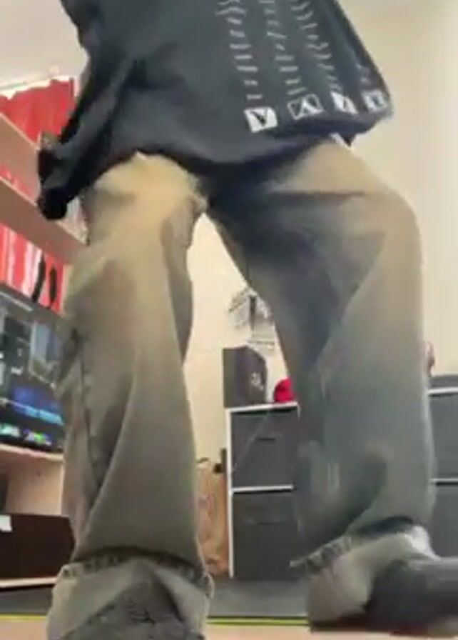 A young, fair-skinned man with curly brown hair is the focus of this medium shot video. He's indoors, standing on a light-colored wooden floor in what appears to be an apartment living room. The man is shirtless, wearing very baggy, faded, gray-blue jeans with a white drawstring. He's pulling a dark gray t-shirt over his head. In the background, there is a shelving unit on the left side of the frame. It contains various items, including a TV playing a program. To the right, there is a black dresser. Overall, the lighting in the room is bright and natural.