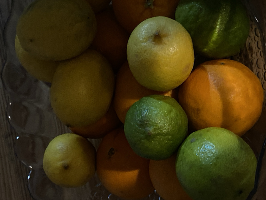 Location: Dobri dial, Bulgaria. Description: The image displays a close-up, overhead view of a clear, patterned glass bowl filled with an assortment of approximately two dozen citrus fruits. The contents include several bright yellow lemons, characterized by their pointed ends; several dark green limes with rougher textures; and numerous round, orange-colored fruits consistent with small oranges or mandarins. The fruits are densely arranged, with some piled upon others. The glass bowl exhibits a scalloped or fluted edge along its rim and a textured bottom. Lighting is dim and uneven, creating shadows among the fruits and highlighting their varied textures. A blurred, light-colored wooden surface is visible in the upper background behind the bowl. No individuals are present, and no actions or interactions are depicted.