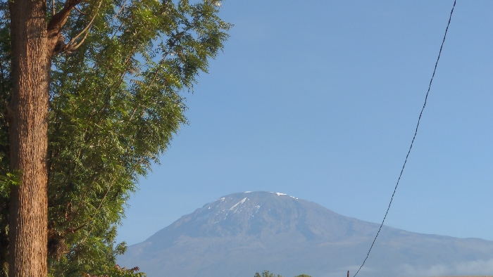 A mountain, lightly dusted with snow on its peak, dominates the center of the frame under a clear, light blue sky. The left side is partially obscured by a large tree with thick, textured bark and full, green foliage. A thin, dark wire diagonally crosses the right side of the sky, creating a visual division. The lower portion of the image is obscured by more foliage and appears to be slightly overexposed.