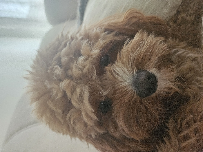 - "The image presents a close-up, head-on view of a light brown, curly-haired dog, resembling a Doodle breed, situated indoors in the city of Burgas, Bulgaria" by FM-1tJ1I3, licensed under CC BY 4.0