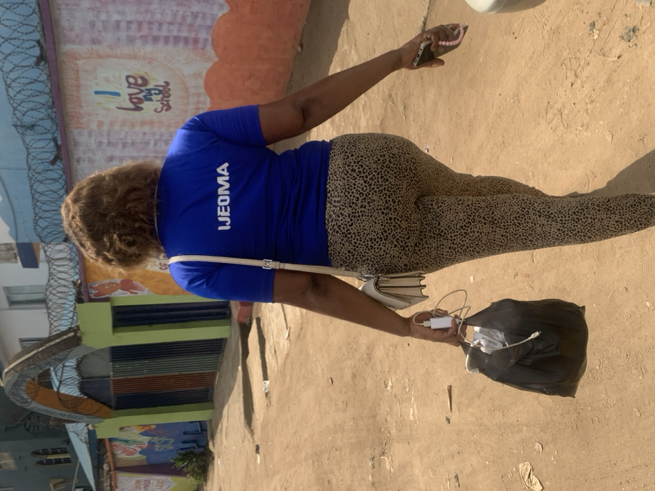 An adult female, viewed from the back, walks on an unpaved dirt road in Ijegun, Nigeria. She has brown, curly, shoulder-length hair and wears a blue short-sleeved t-shirt with "IJEOMA" printed in white capital letters on the back, along with tan-and-black leopard print leggings. A white shoulder bag is carried on her right shoulder, resting at her left hip. Her left hand holds a black plastic bag and a white phone charger with a cable. Her right hand grips a white smartphone featuring a pink beaded wrist strap. To her left, a low wall, painted with colorful murals including children's characters and the phrase "I love my School," features a green arched gate. Steps lead from the dirt road toward this gate. Above the wall, a blue facade is topped with multiple strands of razor wire. In the background, multi-story buildings are visible under bright daylight.