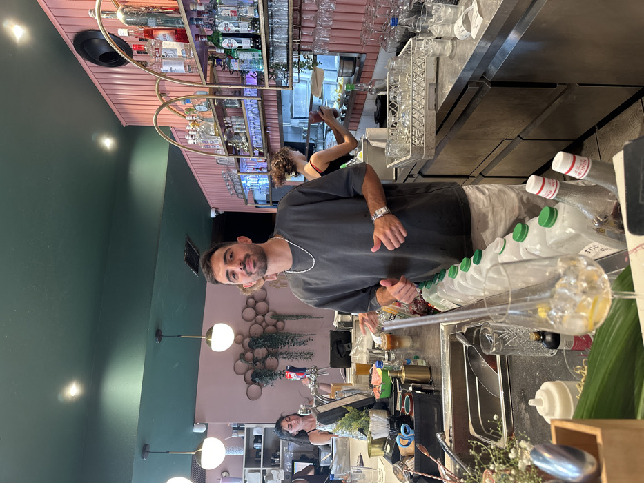 The image depicts the interior of a modern bar or restaurant located in Rishon LeZion, Israel. A male, approximately 20s-30s, with dark hair and a beard, stands centrally behind a stainless steel bar counter, smiling at the camera and giving a double thumbs-up gesture. He wears a dark gray t-shirt, a silver chain necklace, and a watch on his left wrist. To his left, another woman with long dark hair, wearing a patterned top, operates a beverage dispenser. Further in the background on the right, a second woman with curly dark hair, wearing a dark top, is visible behind a service counter, appearing to prepare a drink with red liquid. The bar counter in the foreground and midground is cluttered with various items. On the left, a sink area contains bar tools and small potted plants. In front of the central male figure, a row of white plastic bottles with green caps is visible alongside two Monin syrup bottles. A clear wine glass containing ice and lemon slices, with a long clear straw, rests on the counter. To the right, a plastic crate filled with clear drinking glasses sits on a stainless steel surface. The establishment's interior features a dark teal ceiling and light pink walls, with the right wall exhibiting vertical paneling. Gold-colored arched shelving units display numerous liquor bottles and glassware. On the left wall, circular metal frames with hanging greenery serve as decor. Spherical pendant lights and recessed lighting illuminate the space.