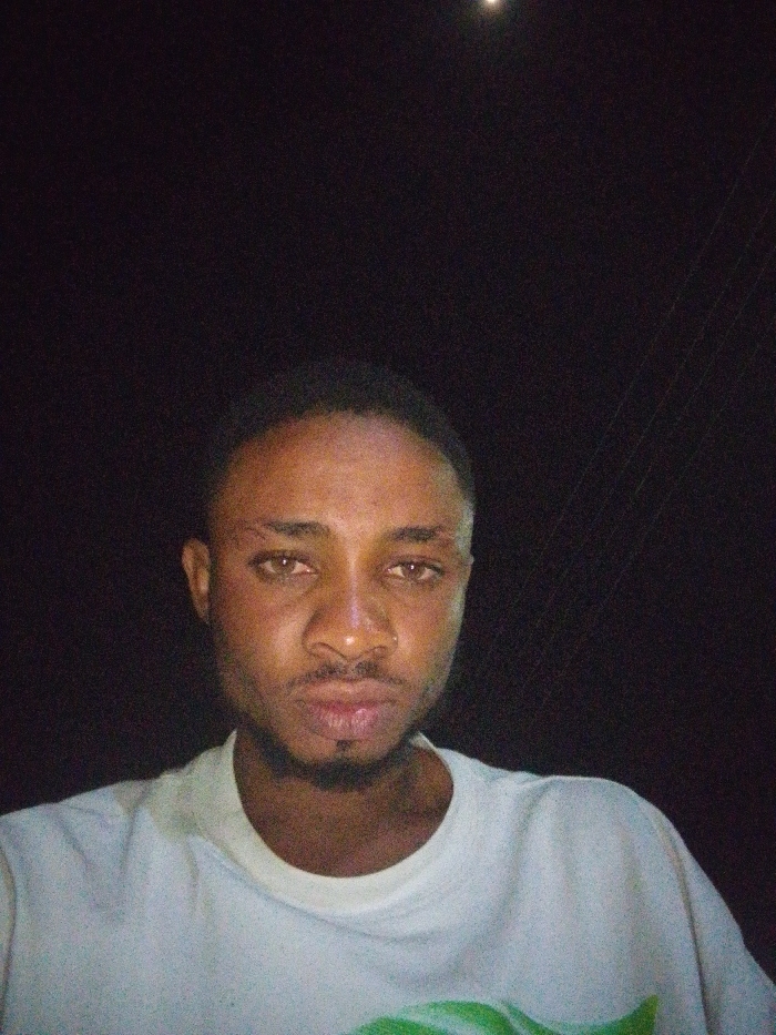 The image depicts a single male individual captured in a close-up, chest-up shot. He appears to be in his twenties or early thirties, with dark skin, short dark hair styled with a fade, and neatly trimmed facial hair consisting of a mustache and goatee. His eyebrows are well-defined, with a small vertical slit visible in his left eyebrow. He is wearing a light-colored, possibly white or off-white, crew-neck t-shirt, with a partial green graphic visible on the lower right of the garment. The individual is looking directly at the camera with a neutral expression. The scene is set outdoors at night in Adankolo, Nigeria, characterized by an almost entirely dark background. A single, faint, circular light source, consistent with a moon or distant street light, is visible in the upper-center of the frame. Faint, diagonal lines, potentially power lines or overhead wires, are discernible in the upper right background. The subject is illuminated by a direct light source, likely a camera flash, contrasting sharply with the dark environment.