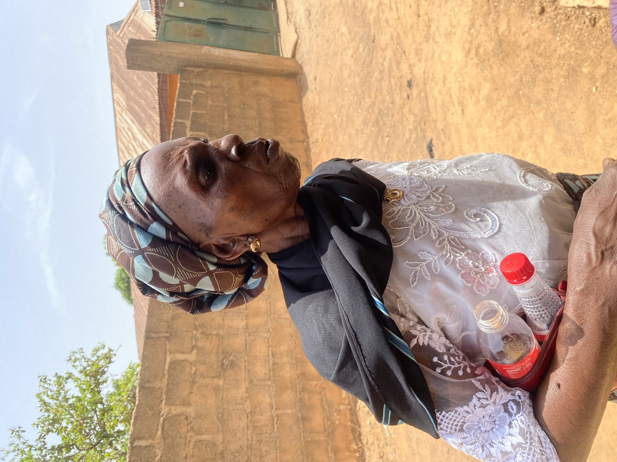 An elderly African woman stands outside in Rido, Nigeria, on a sunny day. She is wearing a patterned headscarf, a white lace-trimmed top, and a black shawl. She holds two small bottles of soda in a red carrier. The background includes a building with a corrugated metal roof and bare ground.