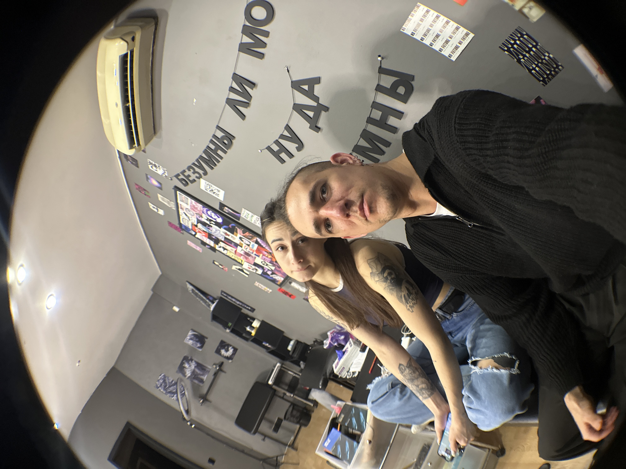 The image is a fisheye-lens selfie taken indoors by two individuals, a male and a female. The male figure is in the foreground, partially cropped on the right side, wearing a black knit cardigan over a white shirt. The female is behind him, slightly to the left, wearing a dark top and light blue ripped jeans. Both have tattoos on their arms. In the background, the walls are grey, adorned with black block lettering that spells out phrases in a Cyrillic alphabet, along with various stickers and images. The background also features equipment, seemingly professional, suggesting a studio or workspace, including lighting, computer monitors, and various machinery. The image has a wide-angle distortion characteristic of a fisheye lens. An air conditioning unit is visible high on the wall in the upper left corner. The individuals appear to be sitting or crouching, as the perspective angles upward. Based on the Cyrillic alphabet in the background, the location is likely in Russia. There are no visual cues to confirm if the location is Saratov or Russia.