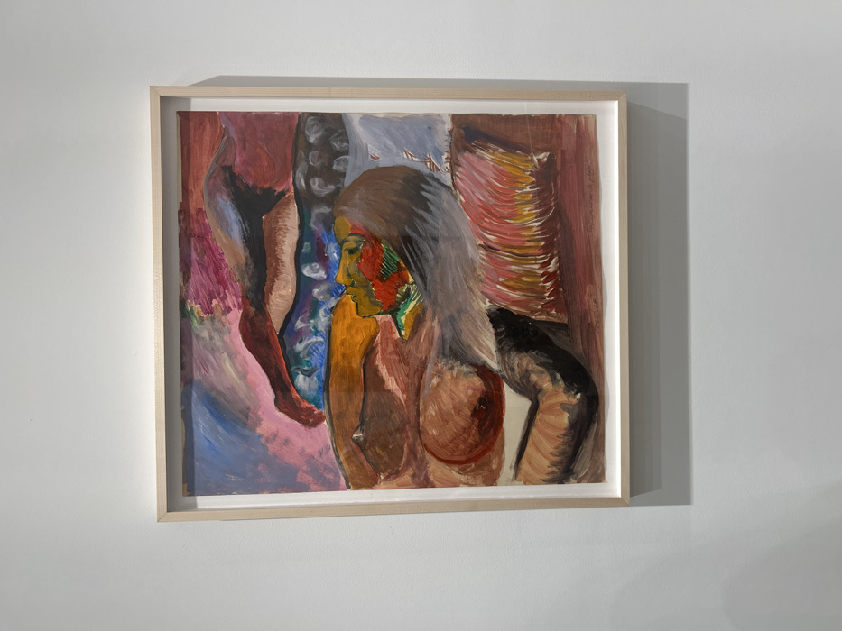 The artwork portrays a figure with striking color accents on the face, rendered in orange, green, and red hues, contrasted with muted gray hair. The body is painted with brown tones, revealing a breast. The background features various forms and color patterns: legs in a standing position. It's framed in a light wood. The artwork is displayed against a plain white wall, and a subtle shadow adds depth.