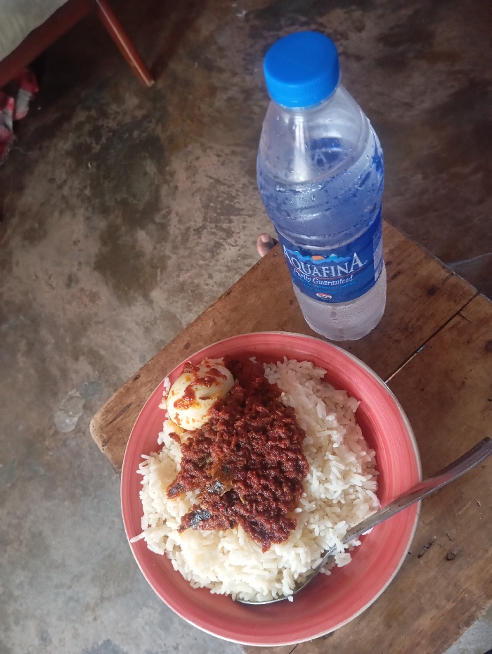The image displays an overhead view of a meal and a bottled beverage placed on a wooden surface in Okere-Urhobo, Nigeria. A reddish-orange plate contains white rice, a serving of reddish-brown stew or sauce with visible pieces of fish, and a halved hard-boiled egg. A metal spoon rests within the plate. Adjacent to the plate, a clear plastic Aquafina water bottle with a blue cap is present, exhibiting condensation on its exterior. The wooden surface, appearing to be a worn stool or small table, supports these items. The background consists of a mottled, light-colored concrete floor. A dark brown wooden furniture leg is visible in the upper left quadrant, and a bare foot is partially discernible near the base of the water bottle.