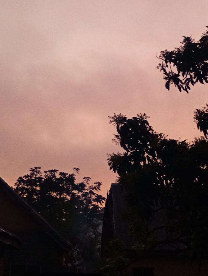 The image depicts an outdoor twilight scene in Barakin Akawo, Nigeria. The sky occupies the upper two-thirds of the frame, displaying a gradient of pink, orange, and light brown hues with visible cloud formations. In the foreground, silhouetted against the ambient light, are multiple trees with dark, dense foliage and visible clusters of small blossoms or fruit. The branches and leaves of these trees are prominent in the upper right and central portions of the image. On the lower left, the dark, sloped roofline of a building is visible, accompanied by a circular object consistent with a satellite dish. On the lower right, another building structure with a distinct gabled or pointed roof is discernible in deep shadow, partially obscured by surrounding tree branches. No human figures, animals, or specific actions are identifiable within the frame.