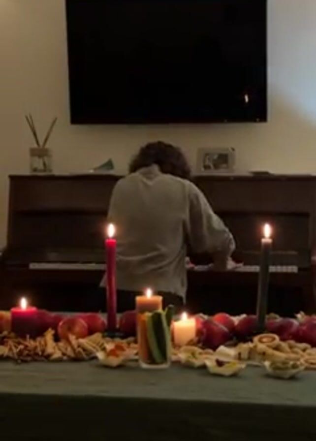 person with curly hair playing an upright piano in a room. The person is wearing a light-colored shirt. The piano is positioned against a wall beneath a large, dark television screen. On top of the piano, there is a small vase with reeds and a framed photograph. In the foreground is a table draped with a green tablecloth, adorned with burning candles, apples, pretzels, and small dishes of food. The floor is wooden. The room is dimly lit.