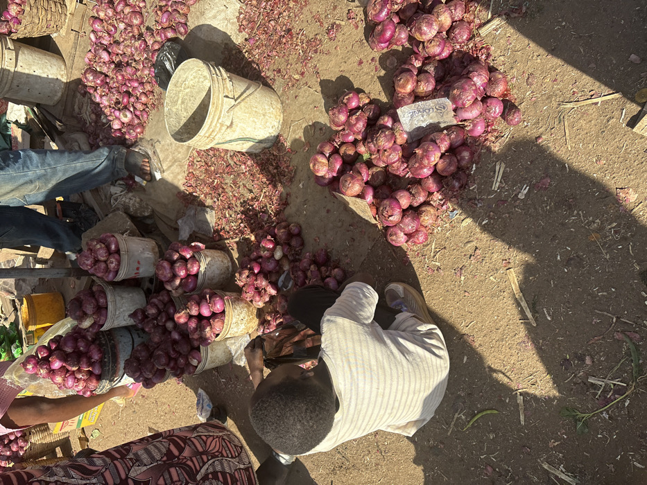This image depicts an outdoor market scene in Rafin Par, Nigeria, specifically an onion stall