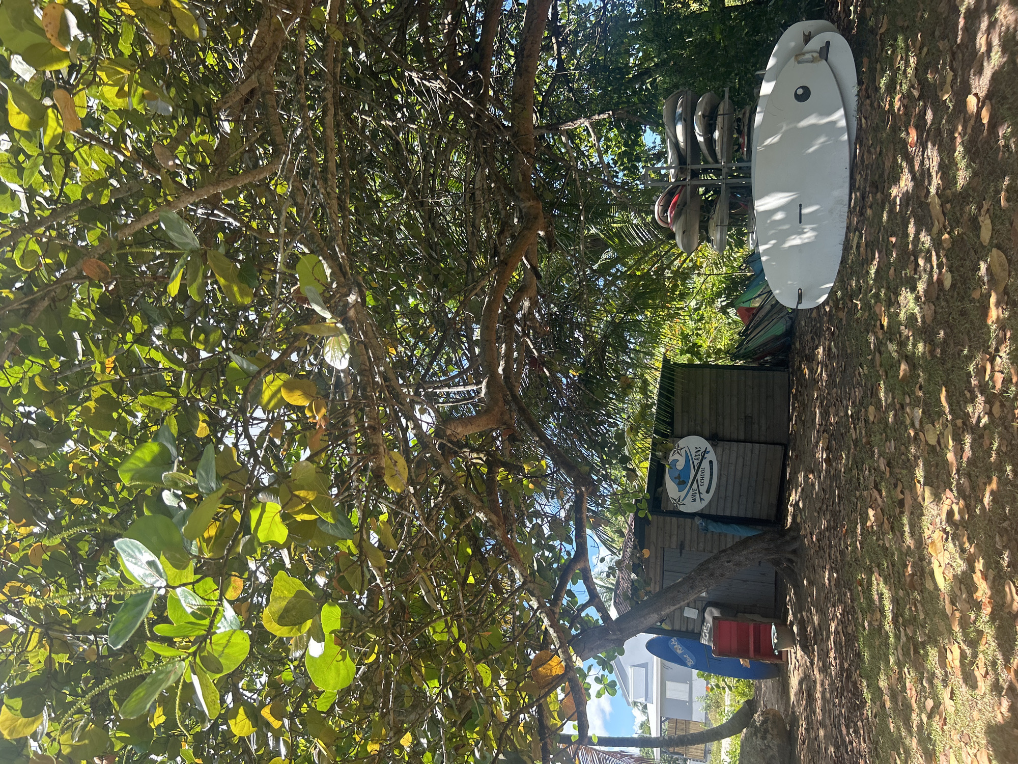n outdoor scene in Sainte-Anne, France. A structure with a sign reading "WAVE SCHOOL RIDING" is partially obscured by a tree. Several surfboards and kayaks are nearby. The area has sandy ground covered in leaves. A building is visible in the background.