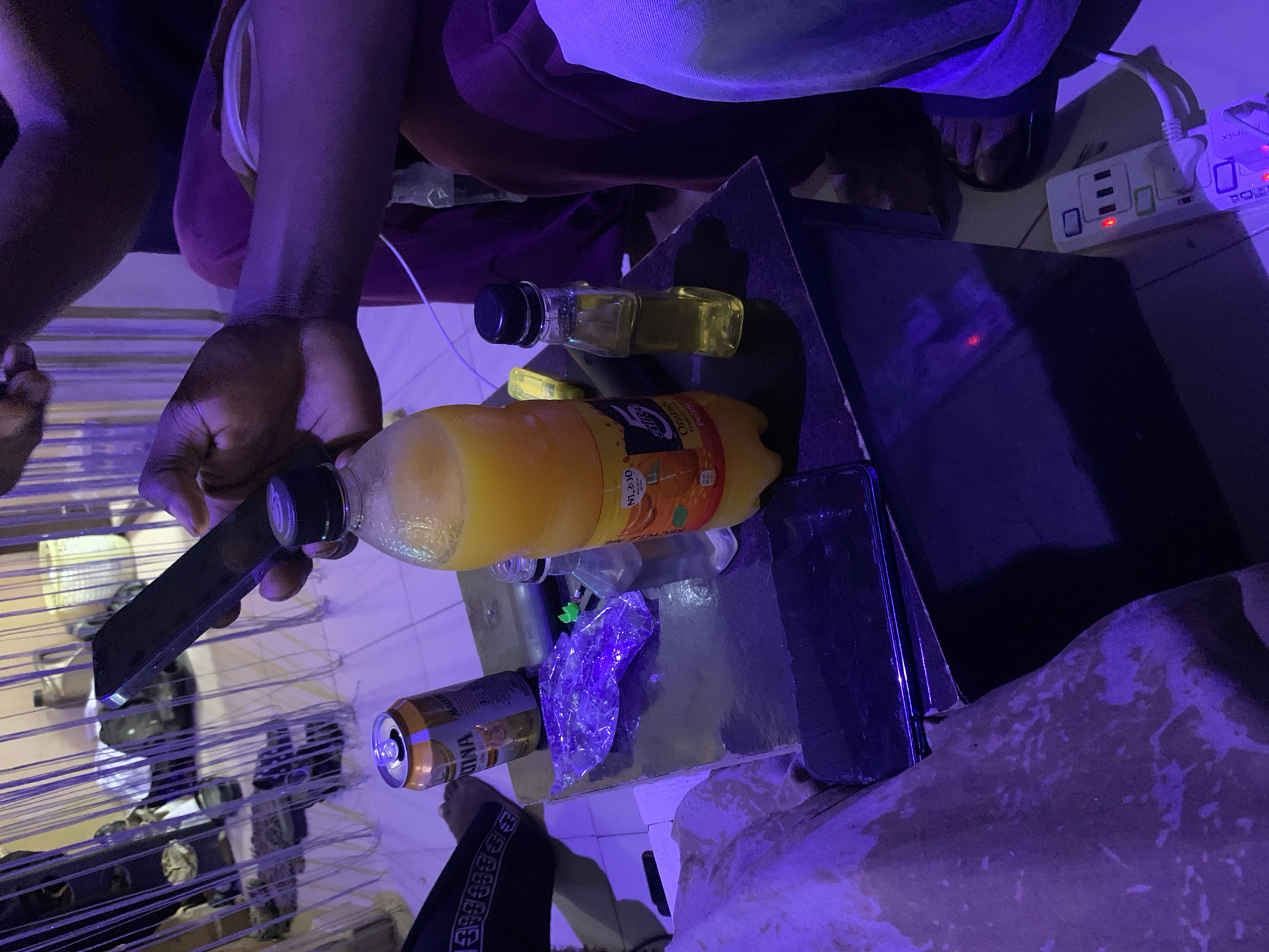 This image depicts an indoor scene in Lokoja, Nigeria, illuminated by a predominant purple-blue ambient light source. The focal point is a dark surface, likely a table, on which several items are placed. On the table, from left to right, an open orange and white Maltina aluminum can is visible. Adjacent to it lies a crumpled, translucent plastic bag. A tall, clear plastic bottle containing an orange-colored pulpy beverage, labeled "5 Alive Orange Pulpy" with "N1,200" visible, stands upright. Next to it is a smaller, clear rectangular plastic bottle filled with a yellowish liquid, topped with a black cap. A dark-colored smartphone rests flat on the table, near the left edge. At least three individuals are partially visible. A dark-skinned right hand holds a black smartphone, its screen partially visible, positioned above the table objects. The arm extends from the upper right quadrant of the image. To the left, a leg covered in light-colored, possibly patterned fabric is visible. To the right, a leg clad in dark reddish-brown fabric is partially seen, with a foot wearing a dark sandal visible near the bottom right. A white cable runs from the vicinity of this individual towards a white power strip on the tiled floor. The background features numerous thin, vertical, translucent or reflective strips hanging, creating a partitioned or decorative element. Beyond these strips, vague shapes of objects, including what appears to be a white basket and a dark container, are discernible. The floor is covered with light-colored tiles. A white power strip with illuminated red indicator lights is positioned on the floor in the lower right corner, connected to a white cable.