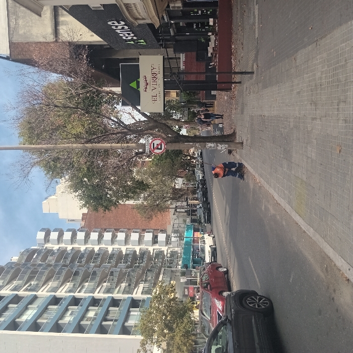 The image displays an urban street scene in Montevideo, Uruguay, observed during daylight under a partially cloudy sky. In the foreground and midground, a paved sidewalk on the right features scattered dry leaves. A utility pole, centrally positioned on the sidewalk, bears a red circular "No Parking" sign. A male street cleaner, dressed in orange and blue work overalls and gloves, is bent over, sweeping leaves into a pile near the curb. Further along the sidewalk, a pedestrian in dark attire walks away from the camera. Commercial establishments line the right side of the street, including "EL VIRREY American Bar," identified by its sign and visible outdoor seating, and an adjacent "sense" business with a dark facade. Trees with a mix of green and bare branches are interspersed along the sidewalk. The asphalt street occupies the left and central portions of the image. A dark SUV is partially visible in the immediate left foreground, with a red SUV positioned behind it, both facing away from the camera. Multiple other vehicles are parked along both sides of the street. The left side of the street is dominated by multi-story residential buildings characterized by white and blue-grey facades and numerous balconies. Additional commercial storefronts are visible at ground level beneath these structures. In the background, taller white and brick-colored buildings are visible, contributing to the urban skyline.