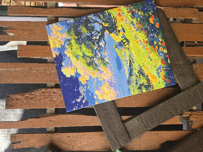 The scene is observed in Chiang Mai City Municipality, Thailand. A vibrant, rectangular landscape artwork, appearing as a digital print on canvas or board, is displayed diagonally, propped against a wooden slatted barrier. The artwork depicts a bright, wide landscape featuring a deep blue sky filled with numerous yellow, orange, and pink clouds. A large, prominent green tree with a dark trunk occupies the mid-right portion of the painting. Below the tree, a small, blue-clad figure or an easel stands on a vivid green hillside. The foreground consists of this green slope densely covered with small, brightly colored flowers in red, orange, yellow, blue, and purple. Distant hills are rendered in cooler blue-green tones. The background structure supporting the artwork is composed of weathered, reddish-brown vertical wooden planks of varying widths, which appear rough and aged. Darker, thicker wooden beams are visible diagonally in the lower left and horizontally, forming part of the irregular support framework for these planks. A dark, possibly fabric or mesh material, is visible behind the wooden slats, with a lighter-colored object partially discernible in the upper right quadrant behind the planks.